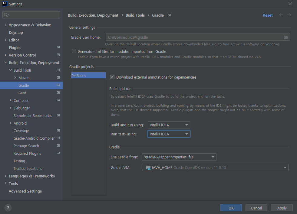 이럴땐 setting창으로 들어가(컨트롤 + 알트 + S) 중간에 Build and run using, Run tests using을