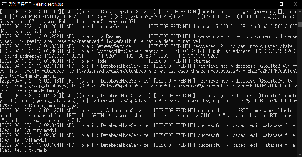 4. /elasticsearch_home/bin/elasticsearch.bat 실행